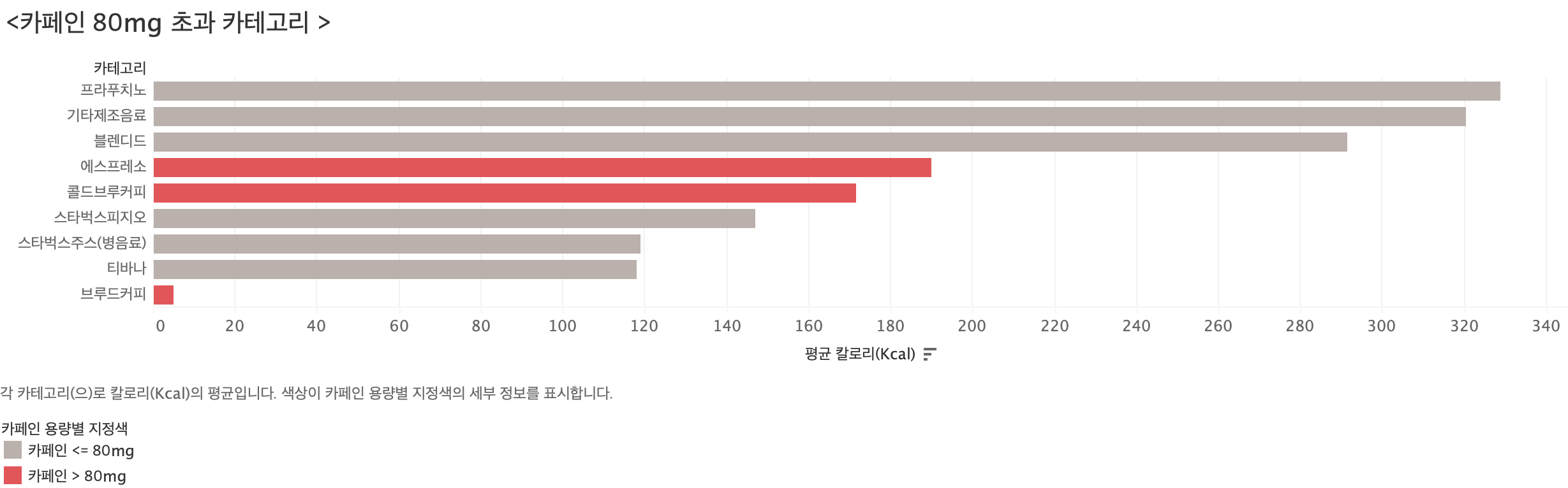 모든 카테고리별로 각 메뉴의 카페인 평균을 계산 했을 때, 카페인 평균이 80mg을 초과한 카테고리는 "에스프레소"와 "콜드브루커피"로 커피 종류인 것으로 나타났다.