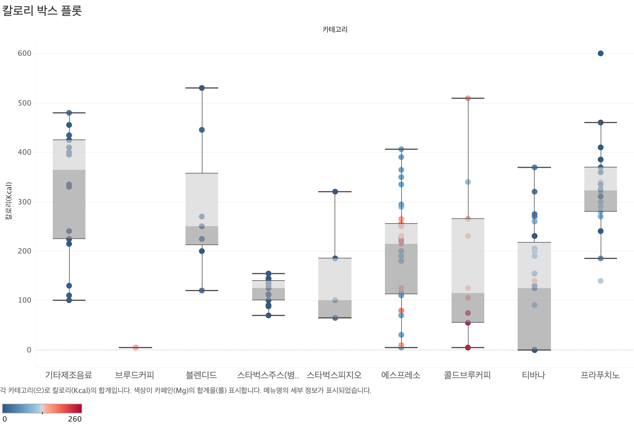 세로축의 높이는 칼로리의 양을 나타내고, 박스 플롯 안에 점의 색깔은 카페인 함유량을 나타내고 있습니다.